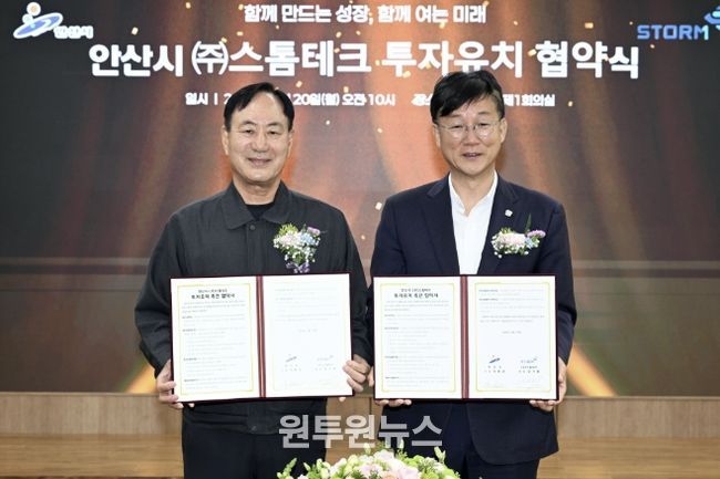 (원투원뉴스) 안산시는 지난 20일 코스닥 상장기업 ㈜스톰테크와 제2공장 신축 및 투자 확대를 위한 협약을 체결했다고 21일 밝혔다.