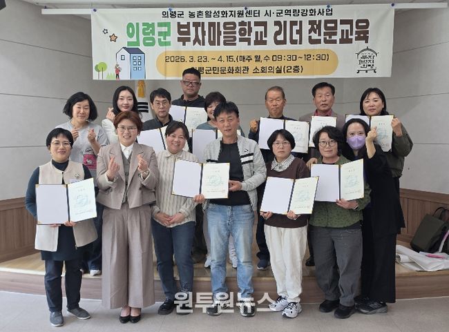 (원투원뉴스) 의령군은 지난 3월부터 추진해 온 ‘2026년 부자마을학교 리더 전문교육’을 마무리하고 12명의 수료생을 배출했다고 밝혔다.