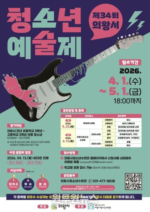 (원투원뉴스) 의왕시청소년재단 산하 의왕시청소년수련관은 지역 청소년의 예술적 재능과 끼 발산의 장인 ‘제34회 의왕시청소년예술제’의 참가자를 5월 1일까지 모집한다고 밝혔다.