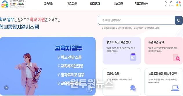 (원투원뉴스) 세종특별자치시교육청학교지원본부(본부장 이미자)는 학교 현장의 행정업무를 온라인에서 한 번에 해결할 수 있는 ‘학교통합지원시스템’ 구축을 완료하고 22일부터 본격적인 운영에 들어간다.