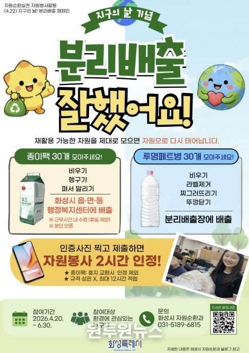 (원투원뉴스) 화성특례시가 2026년 ‘지구의 날(4월 22일)’을 맞아 시민들이 일상 속에서 환경 보호를 실천할 수 있는 자원봉사 활동 '분리배출 잘했어요' 캠페인을 운영한다고 밝혔다.