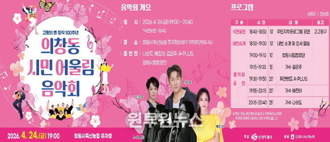 (원투원뉴스) 창원특례시는 오는 24일 19시 창원시축산농협 주차장(의창구 중동 402-2)에서 ‘의창동 시민 어울림 음악회’를 개최한다고 밝혔다.