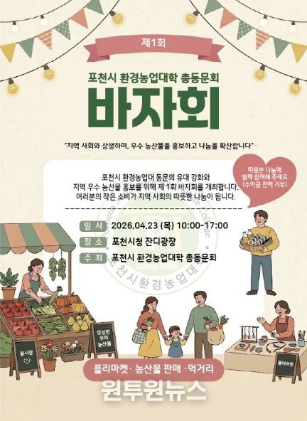 (원투원뉴스) 포천시 환경농업대학 총동문회가 오는 4월 23일, 지역사회와의 상생과 나눔을 실천하기 위한 ‘제1회 나눔 바자회’를 개최한다.