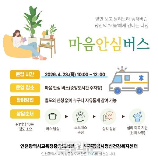 (원투원뉴스) 인천광역시교육청중앙도서관은 오는 23일, 인천정신건강복지센터와 협력하여, 지역 시민들을 위한 찾아가는 마음 돌봄 서비스인 ‘마음안심버스’를 운영한다.