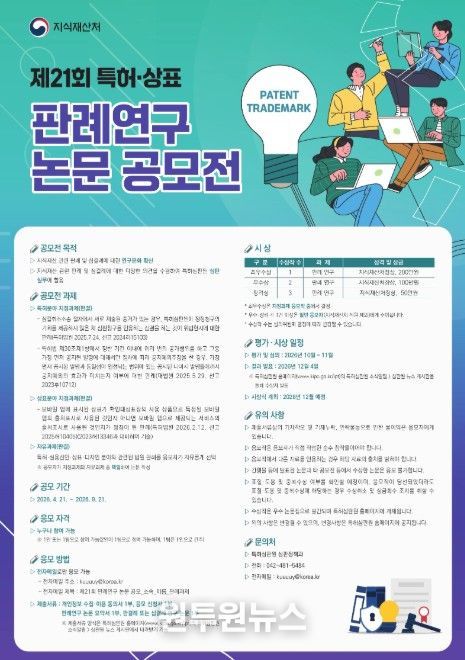 (원투원뉴스) 지식재산처 특허심판원은 지식재산 분야에 대한 연구를 활성화하고 심판제도의 발전 방향을 모색하기 위해 4월 21일~9월 21일까지 '제21회 특허·상표 판례연구논문 공모전'을 개최한다고 밝혔다.