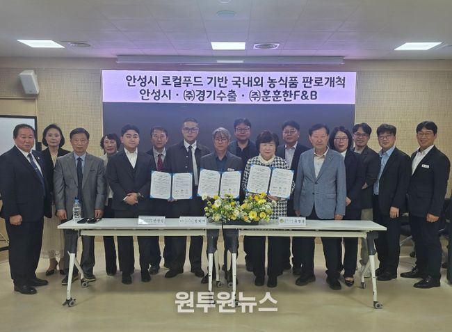 (원투원뉴스) 안성시 농업기술센터는 지난 4월 17일, 안성시 농특산물 및 농식품의 국내외 판로 확대를 위해 ㈜경기수출, ㈜훈훈한F&B와 전략적 업무협약(MOU)을 체결했다고 밝혔다.