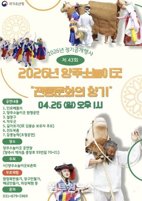 (원투원뉴스) 양주시는 국가유산청의 지원을 받아 ‘제43회 양주소놀이굿 정기공개행사’를 오는 26일 오후 1시, 양주소놀이굿 전수교육관 공연장에서 개최한다고 밝혔다.