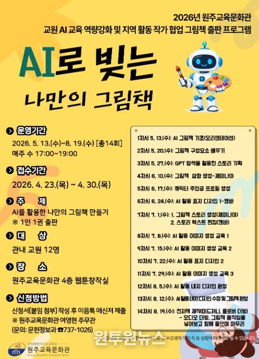 (원투원뉴스) 원주교육문화관은 교원의 미래 교육 역량 강화를 지원하기 위한 인공지능(AI) 활용 그림책 출판 프로그램 ‘AI로 빚는 나만의 그림책’을 오는 5월 13일부터 8월 19일까지 총 14회에 걸쳐 운영할 예정이다.