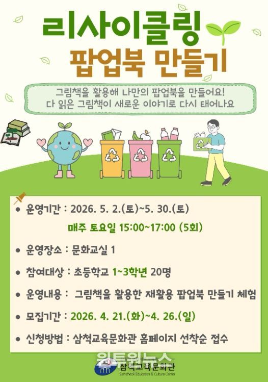 장병진 삼척교육문화관장은 “기존 그림책을 재활용해 팝업북으로 다시 구성하는 활동을 통해 어린이들이 책을 새롭게 바라보고 창의적으로 표현하는 즐거움을 느끼는 한편, 자원 순환의 가치도 자연스럽게 체득하길 바란다”라고 말했다.