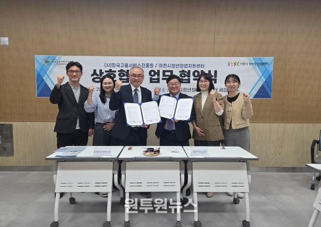 (원투원뉴스) 이천시는 청년 취업 및 창업 지원 강화를 위해 사단법인 한국고용서비스진흥원과 이천시 청년창업지원센터가 지난 4월 15일 센터 세미나실에서 업무협약(MOU)을 체결했다고 밝혔다.