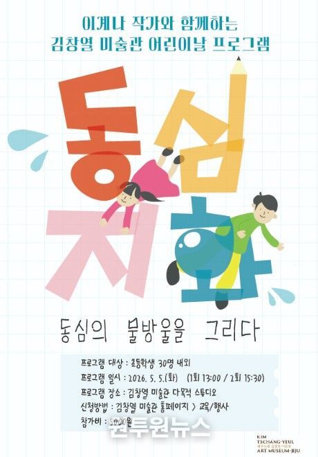 (원투원뉴스) 제주도립 김창열미술관이 어린이날을 맞아 5월 5일 초등학교 학생을 대상으로 특별 프로그램 ‘동심지화(童心之畵), 동심의 물방울을 그리다’의 참가자 30명을 모집한다.