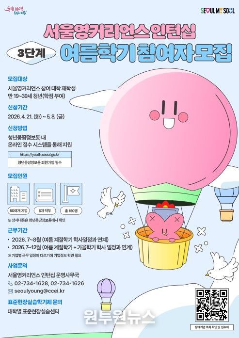 (원투원뉴스) 서울시가 국내 최초로 도입한 초기 청년 대상 단계별 취업 지원책인 ‘서울영커리언스 사업’의 3단계, 인턴십의 여름학기 참여자 150명을 모집한다고 밝혔다.
