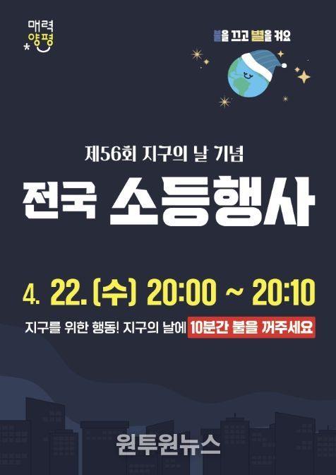 특히 지구의 날 당일인 22일 오후 8시부터 10분간 전 군민이 참여하는 ‘소등 행사’가 진행된다. 양평군청을 비롯한 관내 공공기관은 전면 소등에 참여하고, 공동주택과 일반 가정에서도 자율적으로 동참할 수 있도록 할 계획이다.