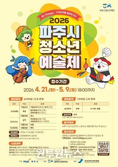 (원투원뉴스) (재)파주시청소년재단 금촌청소년문화의집은 오는 4월 21일부터 5월 9일까지 ‘2026 파주시청소년예술제’ 참가자를 모집한다고 밝혔다. 올해‘Be Happy, 무대위에 피어나다’를 부제로 개최되는 이번 예술제는 제34회 경기도청소년예술제 파주시 공식 예선으로, 파주시 청소년이라면 누구나 참가 신청이 가능하다.