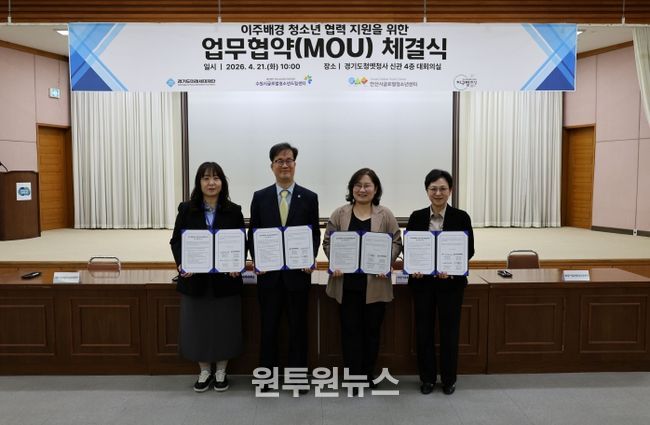 (원투원뉴스) 경기도미래세대재단은 21일 수원시 팔달구 옛 경기도청사에서 수원시글로벌청소년드림센터, 안산시글로벌청소년센터, 화성시글로벌청소년센터와 이주배경 청소년 지원을 위한 업무협약을 체결했다.