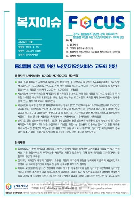 (원투원뉴스) 경기복지재단(대표이사 이용빈)은 통합돌봄 정착을 위한 노인장기요양서비스 고도화 방안을 주제로 '복지이슈포커스 제6호' 보고서를 발간했다.