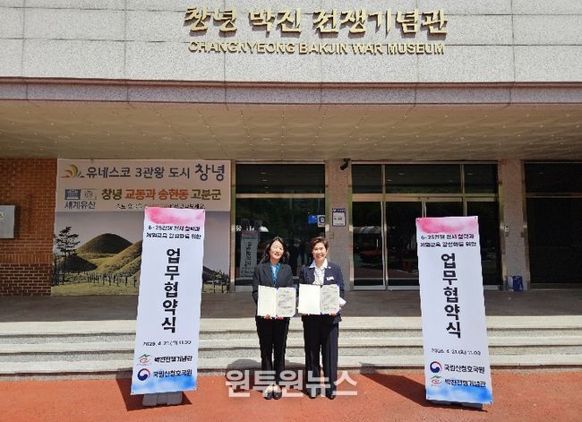 (원투원뉴스) 창녕군 박진전쟁기념관은 21일, 국립산청호국원(원장 김경나)과 업무협약을 체결하고, 6‧25전쟁의 역사적 가치 계승과 호국보훈 문화 확산을 위한 전시 및 교육 협력 체계를 구축했다.