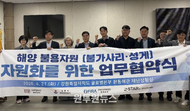 (원투원뉴스) 강릉시는 21일 강원특별자치도청 글로벌본부 환동해관에서 강원특별자치도, 한국수산자원공단 동해본부, ㈜스타스테크와 함께 ‘해양 불용자원 자원화를 위한 업무협약’을 체결했다고 밝혔다.