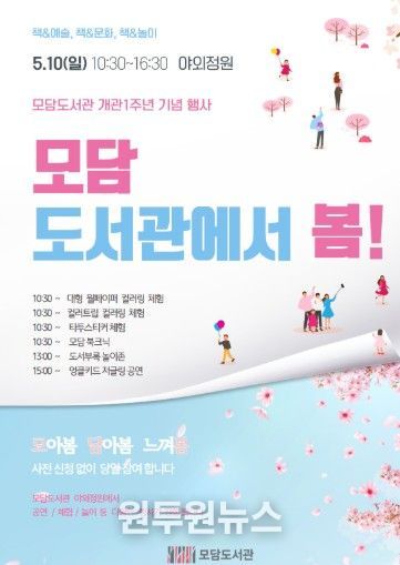 (원투원뉴스) 김포 최대 규모 공공도서관인 모담도서관이 개관 1주년을 맞아 오는 5월 10일 ‘책과 문화·예술·놀이’가 어우러지는 행사를 연다. 이번 행사는 시민들에게 감사의 마음을 전하고 복합문화공간으로서의 역할을 수행하고자 마련된 것으로, 사전예약 없이 도서관 방문자 누구나 참여 가능하다.