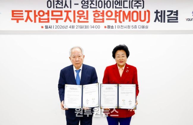 (원투원뉴스) 이천시가 21일 반도체 공정 핵심 설비 기업인 영진아이엔디㈜와 150억 원 규모의 투자업무지원협약을 체결하고, 안정적인 공장 증설을 위한 행정 지원에 나선다.