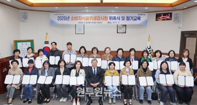 (원투원뉴스) 제주시는 어린이보호구역 등 지역 내 안전한 식품 환경 조성을 위해 4월 21일 시청 본관 회의실에서 소비자식품 위생감시원 위촉식을 개최했다.