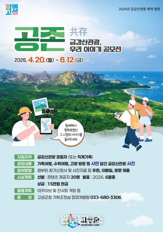 (원투원뉴스) 평화 경제 거점 도시 강원 고성군은 금강산관광의 사회적 가치와 국민의 소중한 기억을 재조명하고, 고성 평화경제특구 지정에 대한 공감대를 확산하기 위해 '공존(共存): 금강산관광, 우리 이야기' 공모전을 개최한다고 밝혔다.