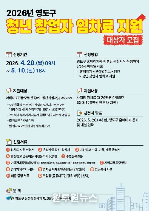 (원투원뉴스) 부산 영도구는 청년 창업가들의 경제적 부담을 덜어주고 지역 내 안정적인 사업 기반 마련을 돕기 위해 지난해에 이어 '2026년 청년 창업자 임차료 지원사업' 참여자를 모집한다고 밝혔다.
