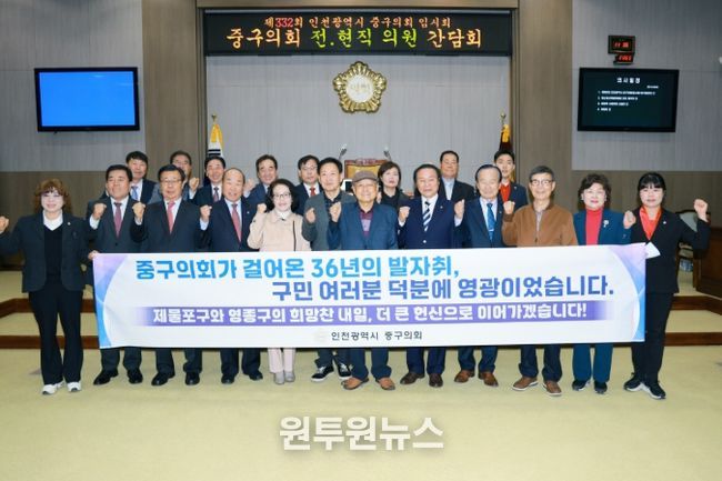 (원투원뉴스) 인천 중구의회는 21일, 제332회 임시회 개회를 맞아 역대 의원들을 초청하여 36년간의 의정 성과를 되돌아보고 향후 행정체제 개편에 대비한 고견을 청취하는 간담회를 개최했다.