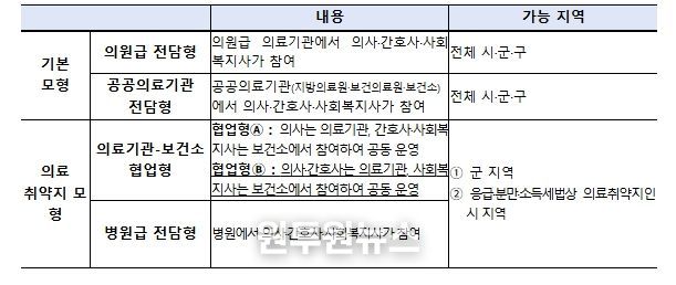 이번 공모에 신설된 모형을 포함한 재택의료센터 참여 모형은 다음 표와 같다.