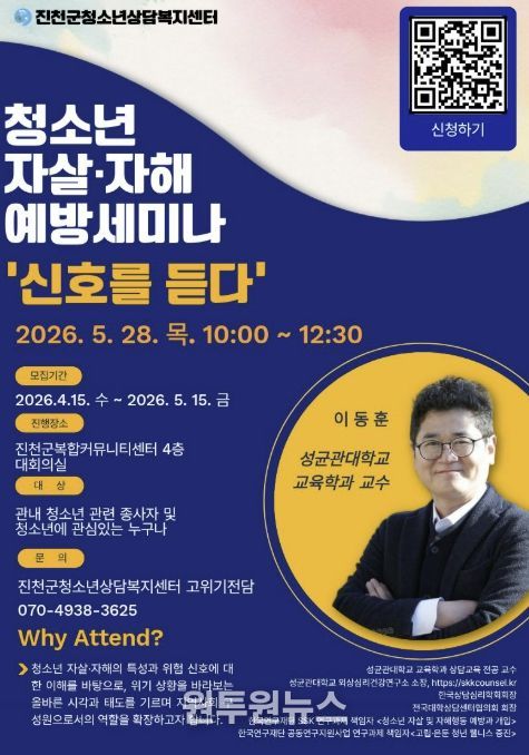 (원투원뉴스) 충북 진천군청소년상담복지센터는 오는 5월 28일 진천군복합커뮤니티센터에서 청소년 자살·자해 예방 세미나 ‘신호를 듣다’를 개최한다고 밝혔다.
