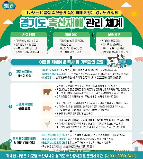 신종광 축산정책과장은 “기후 위기로 폭염이 일상화된 만큼 경기도는 농가와 협력해 선제적 방어 체계를 유지할 것”이라며 “면역증강제 지원과 재해보험 등 가용자원을 총동원해 축산농가가 안심하고 생업에 종사할 수 있도록 최선을 다하겠다”고 말했다.
