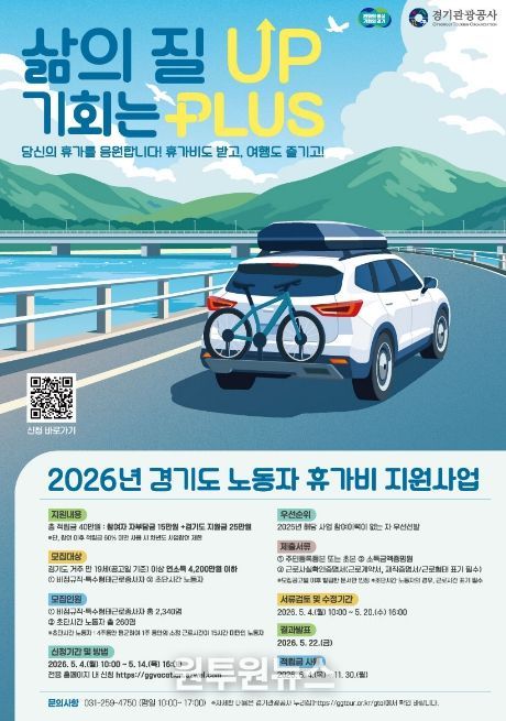 (원투원뉴스) 경기도가 경제적 부담으로 휴식을 포기했던 비정규직과 특수형태근로종사자에게 휴가비를 지원하는 ‘취약노동자 휴가비 지원사업’ 참여자를 5월 4일부터 14일까지 모집한다.