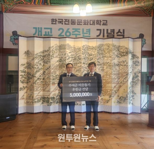 (원투원뉴스) 한국전통문화대학교 교직원일동은 개교 26주년 기념행사에서 저소득 가구의 초·중·고 학생 장학금으로 사용해 달라며 이웃돕기 성금 500만 원을 부여군에 기탁했다고 22일 밝혔다.