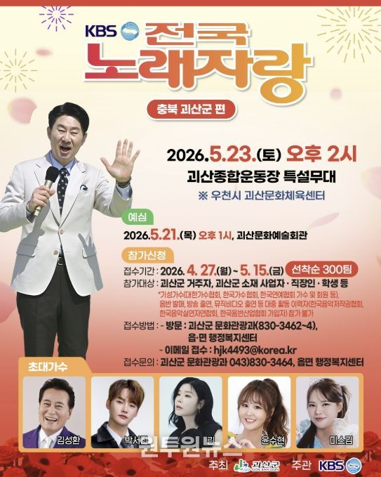 본선 녹화는 5월 23일 토요일 오후 2시 괴산종합운동장에서 개최되며 참가자들의 끼와 열정을 선보이는 무대와 함께 다채로운 축하공연이 펼쳐질 예정이다.