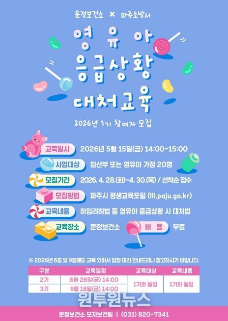 (원투원뉴스) 파주시 운정보건소는 영유아 가정의 안전 역량 강화를 위해 파주소방서와 연계해 ‘영유아 응급상황 대처교육’을 실시한다.