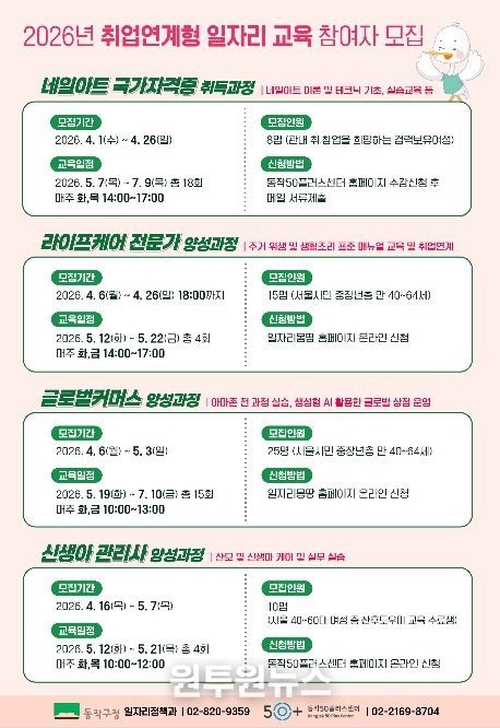 (원투원뉴스) 동작구가 취업을 희망하는 주민의 실무 역량 강화와 현장 진출 지원을 위해 ‘취업연계형 일자리사업’을 확대하고 신규 참여자를 모집한다고 밝혔다.