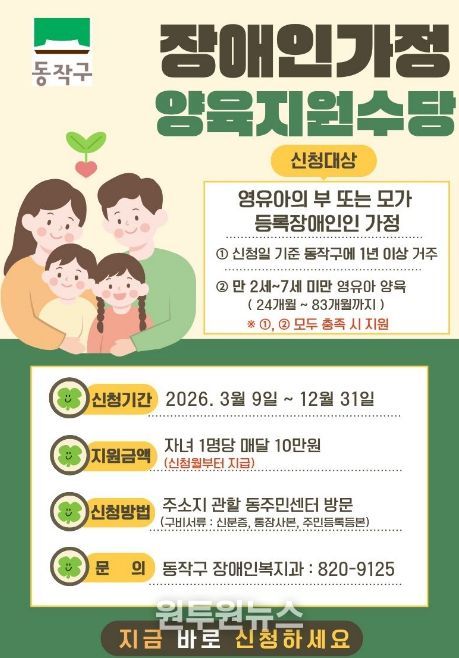 (원투원뉴스) 동작구는 관내 장애인 가정의 경제적 부담을 완화하고, 안정적인 양육 환경을 조성하기 위해 올해부터 ‘장애인가정 양육지원수당’을 새롭게 지급한다고 밝혔다.