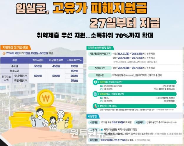 (원투원뉴스) 임실군이 최근 중동지역 긴장 고조에 따른 고유가‧고물가 상황 속에서 군민들의 생활안정을 지원하기 위해 ‘고유가 피해지원금’을 지급한다.