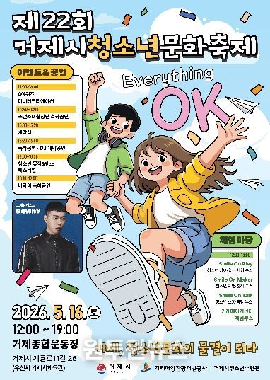 (원투원뉴스) 거제시는 오는 2026년 5월 16일 12:00~19:00, 거제종합운동장(우천 시 거제시체육관)에서 제22회 거제시청소년문화축제 “Everything OK”를 개최한다.
