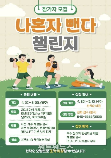 (원투원뉴스) 충남 계룡시는 시민들의 건강한 체중 감량과 올바른 운동 습관 형성을 위해 오는 5월 15일까지 ‘나혼자 뺀다’ 챌린지 참여자 300명을 선착순으로 모집한다고 밝혔다.