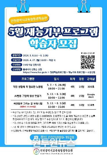 (원투원뉴스) 인천광역시교육청평생학습관은 오는 27일부터 시민의 재능을 나누는 ‘재능기부 프로그램’ 학습자를 모집한다.