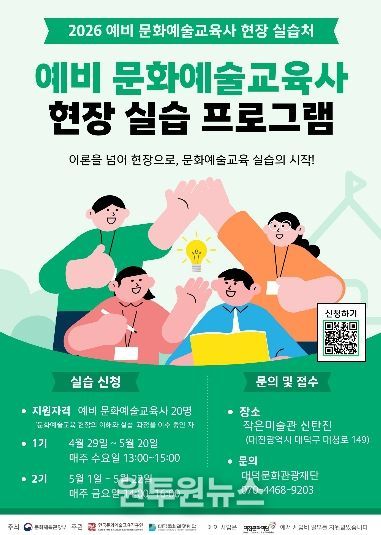 (원투원뉴스) 대덕문화관광재단은 문화예술교육사 2급 자격 취득을 준비하는 예비 인력을 대상으로 현장실습 프로그램을 운영하고 참여자를 모집한다고 밝혔다.