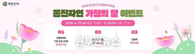 (원투원뉴스) 옹진군은 5월 가정의 달을 맞아 지역 특산물 온라인 판로 확대와 옹진자연몰 이용 활성화를 위해 ‘2026년 옹진자연 가정의 달 맞이 이벤트’를 오는 4월 22일부터 5월 20일까지 총 29일간 운영한다고 밝혔다.