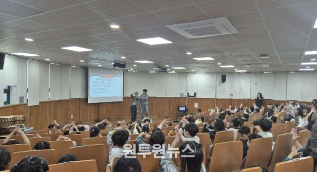 특히 학생들은 “ㄱㅇ”, “ㅅㅆㄱ”, “ㅅㅅㅊ” 등 초성을 보고 ‘감염’, ‘손 씻기’, ‘삼십 초’ 등의 정답을 외치며 즐겁게 교육에 참여했으며, 올바른 손 씻기 방법과 호흡기 감염병 예방수칙을 노래로 익히는 시간을 가졌다. 교육에 참여한 학생들은 “퀴즈로 배우니 재미있고 기억에 잘 남는다”, “집에 가서 가족에게도 알려주겠다”라는 반응을 보이는 등 높은 호응을 보였다.