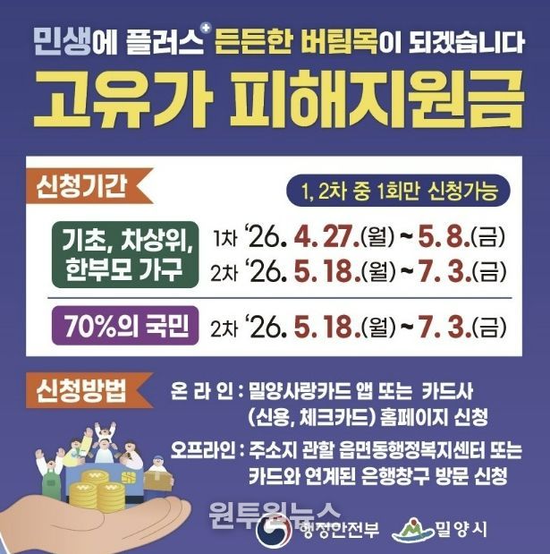 (원투원뉴스) 경남 밀양시는 고유가로 인한 시민 부담 완화를 위해 4월 27일부터 7월 3일까지 ‘고유가 피해지원금’ 신청을 접수한다.