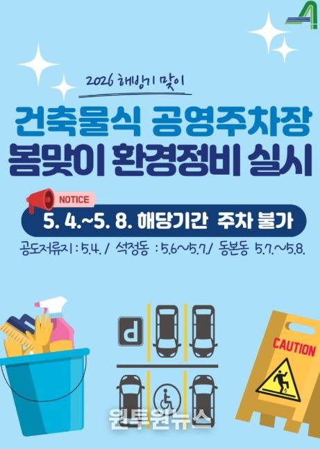 세부 정비 일정은 ▲공도저류지 공영주차장(5월 4일) ▲석정동 공영주차장(5월 6일~7일) ▲동본동 공영주차장(5월 7일~8일) 순으로 진행된다. 공단은 청소 및 시설 보수 시간 중 발생할 수 있는 안전사고를 예방하기 위해 해당 기간 주차장 이용을 일시적으로 제한한다.