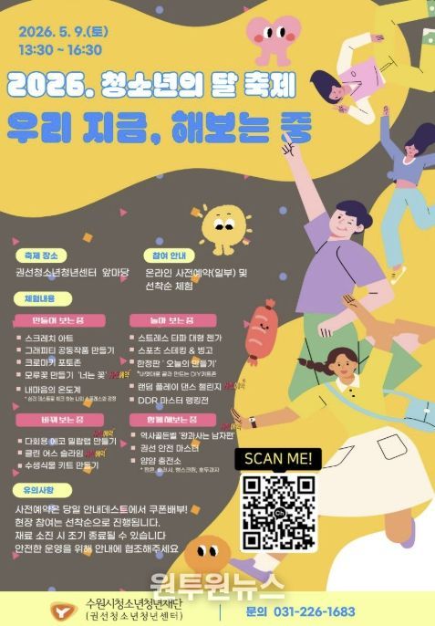 (원투원뉴스) 수원시청소년청년재단 권선청소년청년센터가 오는 5월 9일, 청소년이 주인공이 되어 직접 경험하고 도전하는 참여형 축제 ‘지금우리, 해보는중’을 개최한다고 밝혔다.