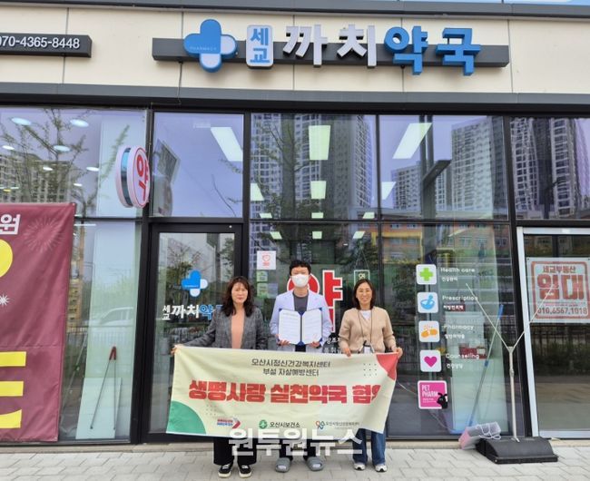 (원투원뉴스) 오산시정신건강복지센터 부설 자살예방센터는 지역사회 기반 생명존중 문화 확산과 자살예방 체계 강화를 위해 지난 20일과 21일 이틀간 관내 약국 4곳과 ‘생명사랑약국’ 업무협약을 체결했다고 밝혔다.