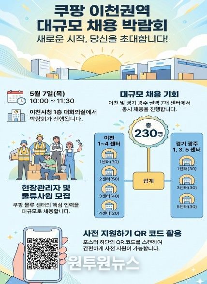 (원투원뉴스) 이천시는 오는 5월 7일 오전 10시부터 11시 30분까지 이천시청 1층 대회의실에서 ‘쿠팡 이천권역 대규모 채용 박람회’를 개최한다.