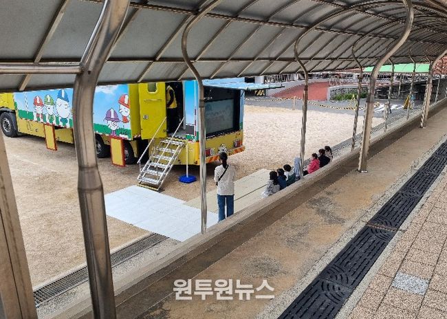 이번 교육은 이론 중심의 안전교육에서 벗어나 학생들이 직접 체험을 통해 재난 상황 대처 방법을 익히도록 하기 위해 마련됐다. 학교 운동장에 설치된 특수 제작 차량 내부에서 다양한 상황을 간접적으로 경험하는 방식으로 진행됐다.